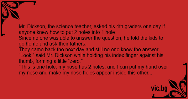 Mr. Dickson, the science teacher, asked his 4th graders one day if anyone knew how to put 2 holes into 1 hole.