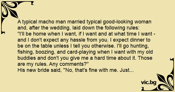 Typowy macho poślubił typową laleczkę. Po ślubie facet wprowadza swoje zasady: - Będę w domu, kiedy chcę, jeśli chcę i o której godzinie chcę. Nie chcę słyszeć z tego powodu żadnych wyrzutów....