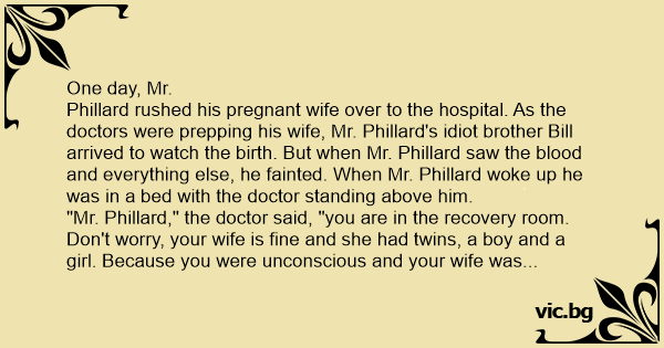 Phillard rushed his pregnant wife over to the hospital. As the doctors were prepping his wife, Mr. Phillard's idiот brother Bill arrived to watch the birth. But when Mr. Phillard saw the blood and everything else, he fainted. When Mr. Phillard woke up he was in a bed with the doctor standing above him.