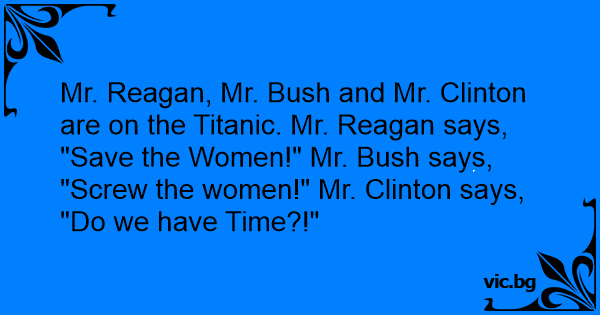 Mr. Reagan, Mr. Bush and Mr. Clinton are on the Titanic. Mr. Reagan says, "Save the Women!" Mr. Bush says, "Sсrеw the women!" Mr. Clinton says, "Do we have Time?!"