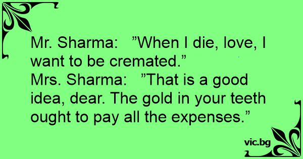 Mrs. Sharma: ”That is a good idea, dear. The gold in your teeth ought to pay all the expenses.”