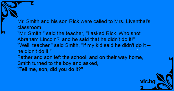 "Mr. Smith," said the teacher, "I asked Rick 'Who shot Abraham Lincoln?' and he said that he didn't do it!"