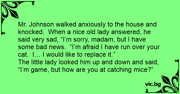 Mr. Johnson walked anxiously to the house and knocked. When a nice old lady answered, he said very sad, “I’m sorry, madam, but I have some bad news. “I’m afraid I have run over your cat. I… I would like to replace it.”