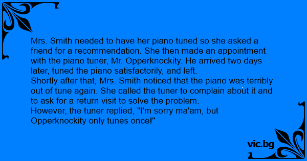 Mrs. Smith needed to have her piano tuned so she asked a friend for a recommendation. She then made an appointment with the piano tuner, Mr. Opperknockity. He arrived two days later, tuned the piano satisfactorily, and left.