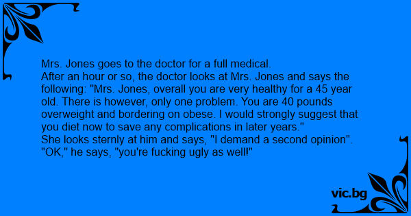 After an hour or so, the doctor looks at Mrs. Jones and says the following: "Mrs. Jones, overall you are very healthy for a 45 year old. There is however, only one problem. You are 40 pounds overweight and bordering on obese. I would strongly suggest that you diet now to save any complications in later years."