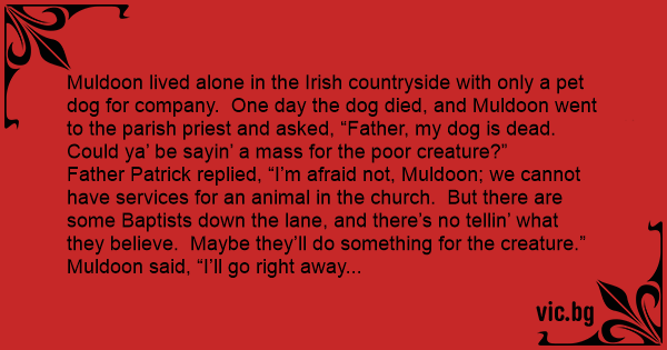 Father Patrick replied, “I’m afraid not, Muldoon; we cannot have services for an animal in the church. But there are some Baptists down the lane, and there’s no tellin’ what they believe. Maybe they’ll do something for the creature.”