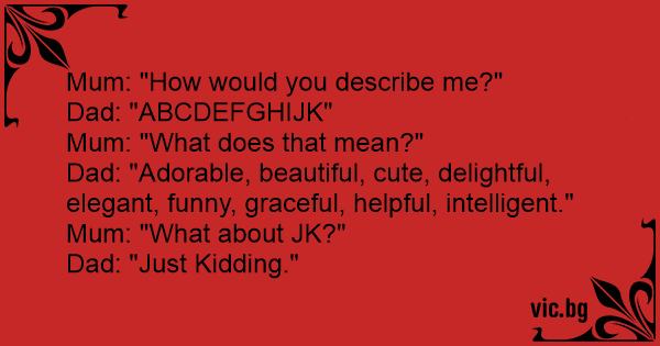 Dad: "Adorable, beautiful, cute, delightful, elegant, funny, graceful, helpful, intelligent."