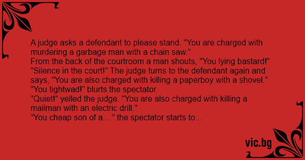 A judge asks a defendant to please stand. "You are charged with murdering a garbage man with a chain saw."