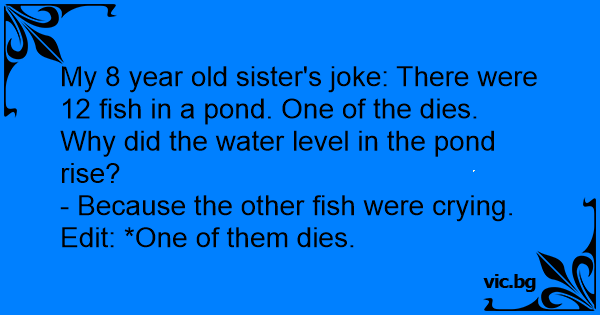 My 8 year old sister's joke: There were 12 fish in a pond. One of the dies. Why did the water level in the pond rise?