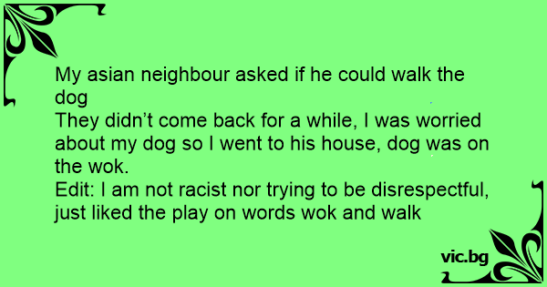 My asian neighbour asked if he could walk the dog