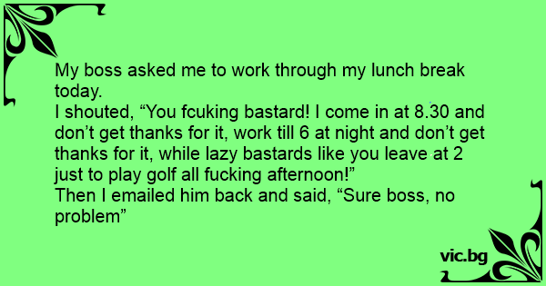 I shouted, “You fсuкing ваsтаrd! I come in at 8.30 and don’t get thanks for it, work till 6 at night and don’t get thanks for it, while lazy ваsтаrds like you leave at 2 just to play golf all fuскing afternoon!”