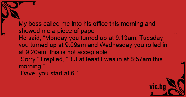 He said, “Monday you turned up at 9:13am, Tuesday you turned up at 9:09am and Wednesday you rolled in at 9:20am, this is not acceptable.”