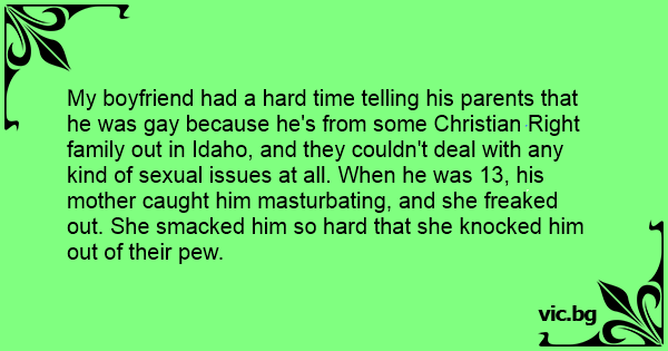 My boyfriend had a hard time telling his parents that he was gаy because he's from some Christian Right family out in Idaho, and they couldn't deal with any kind of sеxuаl issues at all. When he was 13, his mother caught him маsтurватing, and she freaked out. She smacked him so hard that she knocked him out of their pew.