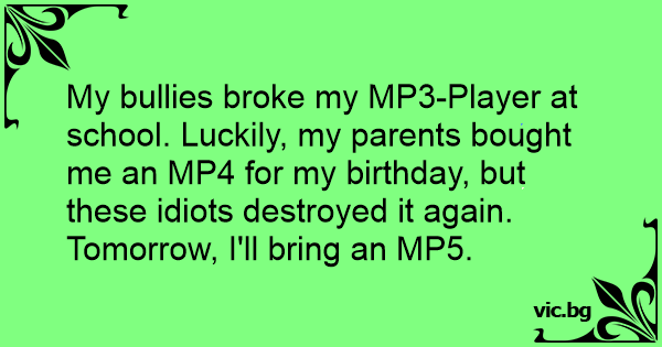 My bullies broke my MP3-Player at school. Luckily, my parents bought me an MP4 for my birthday, but these idiots destroyed it again.