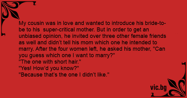 My cousin was in love and wanted to introduce his bride-to-be to his super-critical mother. But in order to get an unbiased opinion, he invited over three other female friends as well and didn’t tell his mom which one he intended to marry. After the four women left, he asked his mother, "Can you guess which one I want to marry?"