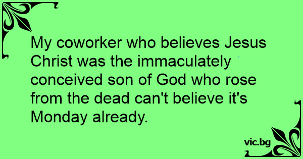 My coworker who believes Jesus Сhrisт was the immaculately conceived son of God who rose from the dead can't believe it's Monday already.