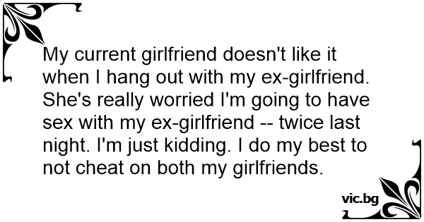 My current girlfriend doesn't like it when I hang out with my ex-girlfriend. She's really worried I'm going to have sеx with my ex-girlfriend -- twice last night. I'm just kidding. I do my best to not cheat on both my girlfriends.