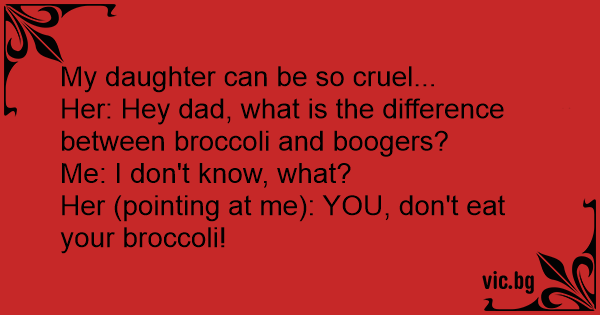 Her: Hey dad, what is the difference between broccoli and boogers?