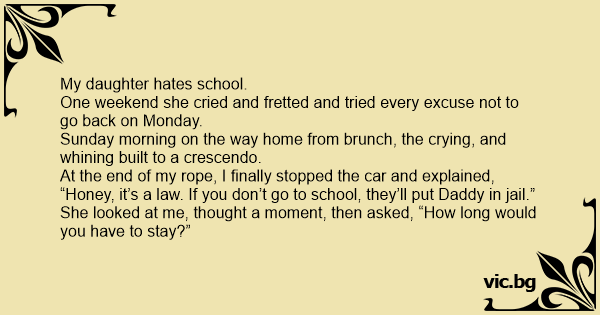 At the end of my rope, I finally stopped the car and explained, “Honey, it’s a law. If you don’t go to school, they’ll put Daddy in jail.”