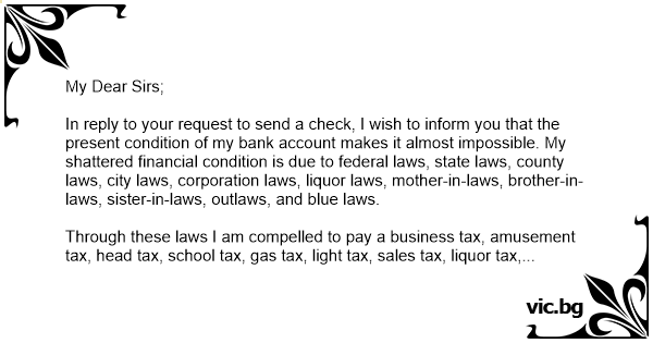 In reply to your request to send a check, I wish to inform you that the present condition of my bank account makes it almost impossible. My shattered financial condition is due to federal laws, state laws, county laws, city laws, corporation laws, liquor laws, mother-in-laws, brother-in-laws, sister-in-laws, outlaws, and blue laws.
