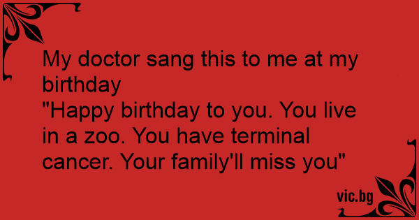 "Happy birthday to you. You live in a zoo. You have terminal cancer. Your family'll miss you"