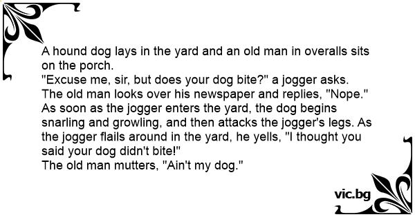 As soon as the jogger enters the yard, the dog begins snarling and growling, and then attacks the jogger's legs. As the jogger flails around in the yard, he yells, "I thought you said your dog didn't bite!"
