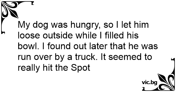 My dog was hungry, so I let him loose outside while I filled his bowl. I found out later that he was run over by a truck. It seemed to really hit the Spot