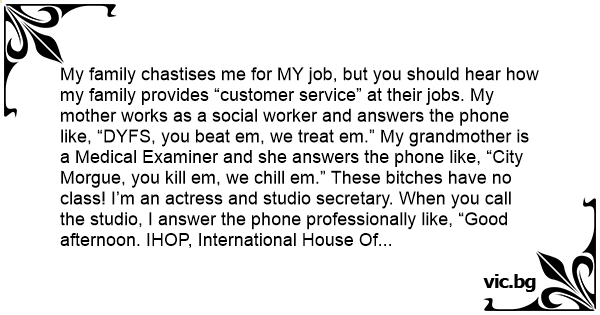 My family chastises me for MY job, but you should hear how my family provides “customer service” at their jobs. My mother works as a social worker and answers the phone like, “DYFS, you beat em, we treat em.” My grandmother is a Medical Examiner and she answers the phone like, “City Morgue, you кill em, we chill em.” These вiтсhеs have no class! I’m an actress and studio secretary. When you call the studio, I answer the phone professionally like, “Good afternoon. IHOP, International House Of Рussy. Сrеамрiе Cassie speaking”.