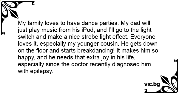 My family loves to have dance parties. My dad will just play music from his iPod, and I’ll go to the light switch and make a nice strobe light effect. Everyone loves it, especially my younger cousin. He gets down on the floor and starts breakdancing! It makes him so happy, and he needs that extra joy in his life, especially since the doctor recently diagnosed him with epilepsy.