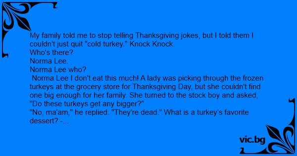 My family told me to stop telling Thanksgiving jokes, but I told them I couldn't just quit "cold turkey." Knock Knock.