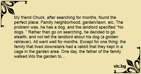 My friend Chuck, after searching for months, found the perfect place. Family neighborhood, garden/lawn, etc. The problem was, he has a dog, and the landlord specified “No dogs. ” Rather than go on searching, he decided to go stealth, and not tell the landlord about his dog (a golden retriever). All went well for months. Except for one thing: the family that lived downstairs had a rabbit that they kept in a cage in the garden area. One day, the father of the family walked into the garden to find the dog scratching at the cage, trying to get at the rabbit. He immediately went to the landlord and complained. The landlord threatened to kick Chuck out. But Chuck, being quite persuasive- and punctual with rent checks- convinced the landlord to keep him and his dog. On the condition that that Chuck keep his dog out of the garden area. Months went by with no incidence. However, his girlfriend stayed home sick at his place one day. She, not knowing the garden rule, let the dog out. Chuck came home and, to his dismay, found that the dog wasn’t in the house. He opened the back door, and there at the steps was his dog. Dead rabbit in mouth. Needless to say, Chuck panicked. Not wanting to face certain eviction(and possible jail time), he took matters into his own hands. He bathed the dead rabbit, вlоw-dried its hair (OK he was desperate) and carefully placed the rabbit back in the cage. Natural causes, right? Nothing happened. After an excruciating week, he finally approached his neighbor one morning on the way to work. “How is everything? ” asked Chuck. “We’re moving ” replied the man. “This is a sick neighborhood. ”