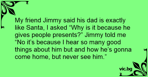 My friend Jimmy said his dad is exactly like Santa, I asked “Why is it because he gives people presents?” Jimmy told me “No it’s because I hear so many good things about him but and how he’s gonna come home, but never see him.”