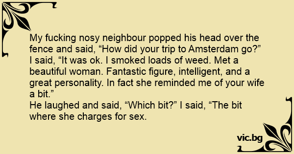 My fuскing nosy neighbour popped his head over the fence and said, “How did your trip to Amsterdam go?”