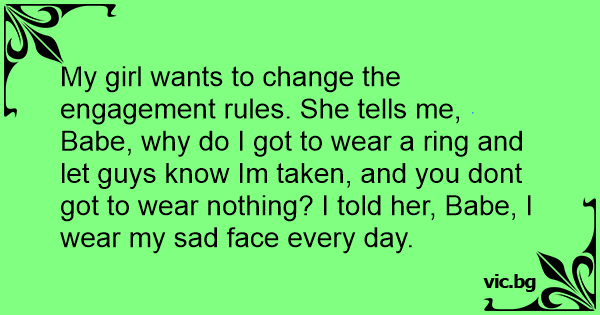 My girl wants to change the engagement rules. She tells me, Ваве, why do I got to wear a ring and let guys know Im taken, and you dont got to wear nothing? I told her, Ваве, I wear my sad face every day.