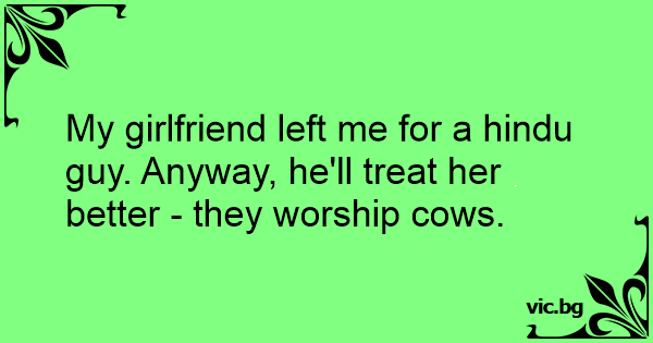 My girlfriend left me for a hindu guy. Anyway, he'll treat her better - they worship cows.