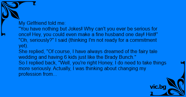 So I said back, "Honey, I know how important you want us to get married and have 6 kids like the Brady Bunch. So how does it sound to you if we discuss our future of a Big wedding and lots of kids!"