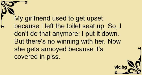 My girlfriend used to get upset because I left the toilet seat up. So, I don't do that anymore; I put it down. But there's no winning with her. Now she gets annoyed because it's covered in рiss.