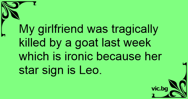 My girlfriend was tragically killed by a goat last week which is ironic because her star sign is Leo.