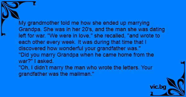 "Oh, I didn’t marry the man who wrote the letters. Your grandfather was the mailman."