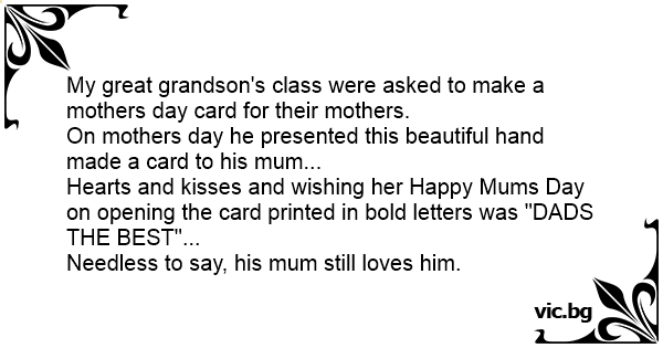 Hearts and kisses and wishing her Happy Mums Day on opening the card printed in bold letters was "DADS THE BEST"...