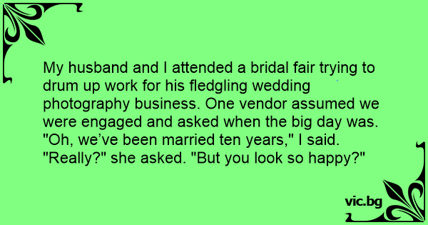 My husband and I attended a bridal fair trying to drum up work for his fledgling wedding photography business. One vendor assumed we were engaged and asked when the big day was.