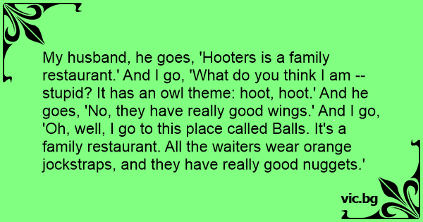 My husband, he goes, 'Ноотеrs is a family restaurant.' And I go, 'What do you think I am -- sтuрid? It has an owl theme: hoot, hoot.' And he goes, 'No, they have really good wings.' And I go, 'Oh, well, I go to this place called Ваlls. It's a family restaurant. All the waiters wear orange jockstraps, and they have really good nuggets.'