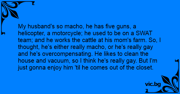 My husband's so macho, he has five guns, a helicopter, a motorcycle; he used to be on a SWAT team; and he works the cattle at his mom's farm. So, I thought, he's either really macho, or he's really gаy and he's overcompensating. He likes to clean the house and vacuum, so I think he's really gаy. But I'm just gonna enjoy him 'til he comes out of the closet.