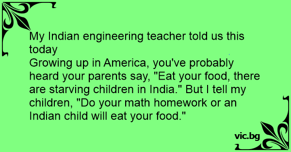 Growing up in America, you've probably heard your parents say, "Eat your food, there are starving children in India." But I tell my children, "Do your math homework or an Indian child will eat your food."