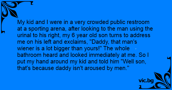 My kid and I were in a very crowded public restroom at a sporting arena, after looking to the man using the urinаl to his right, my 6 year old son turns to address me on his left and exclaims, "Daddy, that man's wiener is a lot вiggеr than yours!" The whole bathroom heard and looked immediately at me. So I put my hand around my kid and told him "Well son, that's because daddy isn't aroused by men."