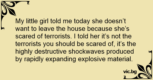 My little girl told me today she doesn’t want to leave the house because she’s scared of terrorists. I told her it’s not the terrorists you should be scared of, it’s the highly destructive shockwaves produced by rapidly expanding explosive material.