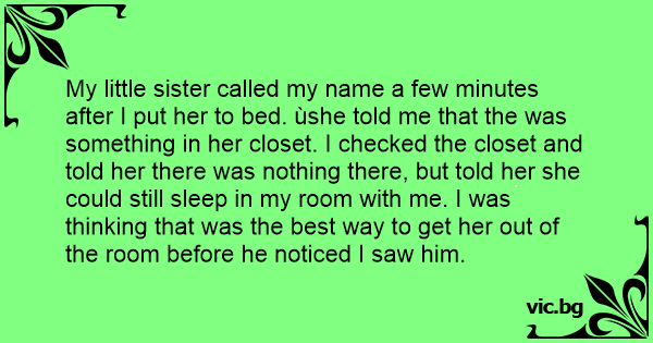 My little sister called my name a few minutes after I put her to bed. ùshe told me that the was something in her closet. I checked the closet and told her there was nothing there, but told her she could still sleep in my room with me. I was thinking that was the best way to get her out of the room before he noticed I saw him.