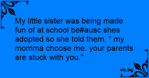 My little sister was being made fun of at school be#ausc shes adopted so she told them, " my momma choose me. your parents are stuck with you."