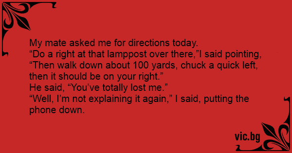 “Do a right at that lamppost over there,”I said pointing, “Then walk down about 100 yards, chuck a quick left, then it should be on your right.”