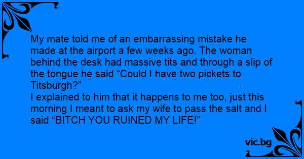 My mate told me of an embarrassing mistake he made at the airport a few weeks ago. The woman behind the desk had massive тiтs and through a slip of the tongue he said “Could I have two pickets to Titsburgh?”